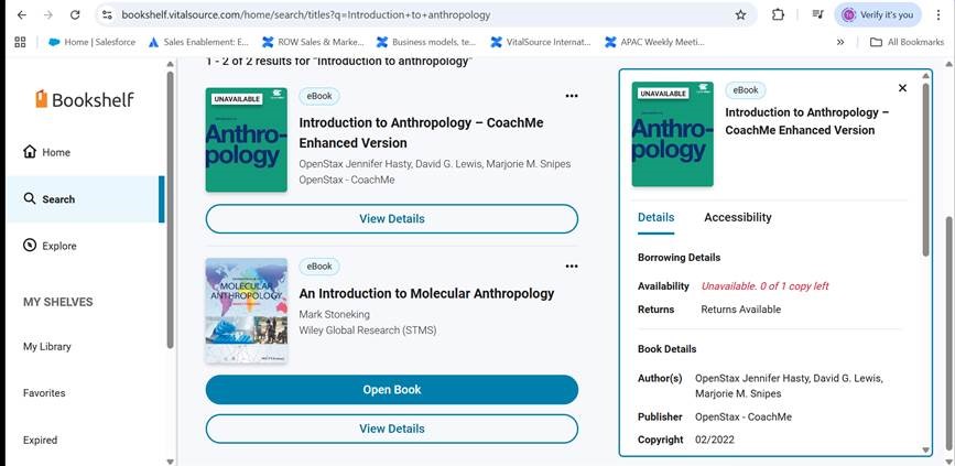 When all accesses are utilised, an “UNAVAILABLE” pop up will appear on the book cover in Explore home page or when a user searches for the title. Please see the screen shots below for the Anthropology title: